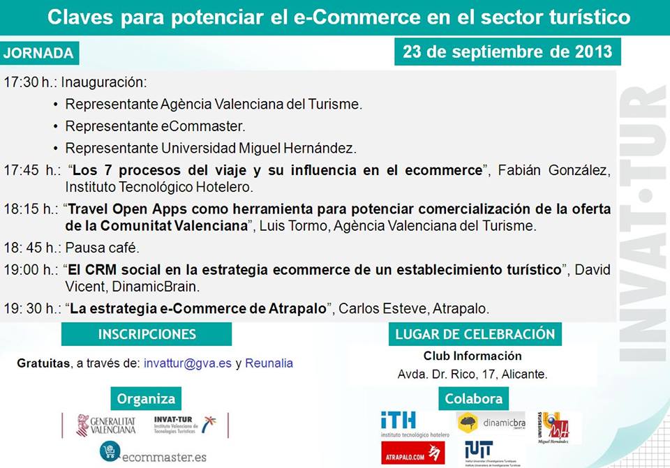 El día 23 de septiembre de 2013 estaré participando en el Club Información de Alicante en la jornada Claves para potenciar el e-commerce en el sector turístico que se celebrará de 17:30 a 20:00 horas.