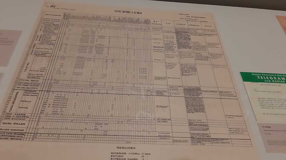 En las vitrinas se muestran una gran variedad de documentos: las referencias a sus películas en revistas de cine, el detalle de los planes de rodaje o la actuación de la censura a través de las fichas de la Junta de Clasificación y Censura -Berlanga tuvo que luchar para llevar adelante su mirada crítica en los años de represión de la España franquista- que constituyen auténticas fuentes históricas para analizar la historia del cine y de la sociedad española de la época.