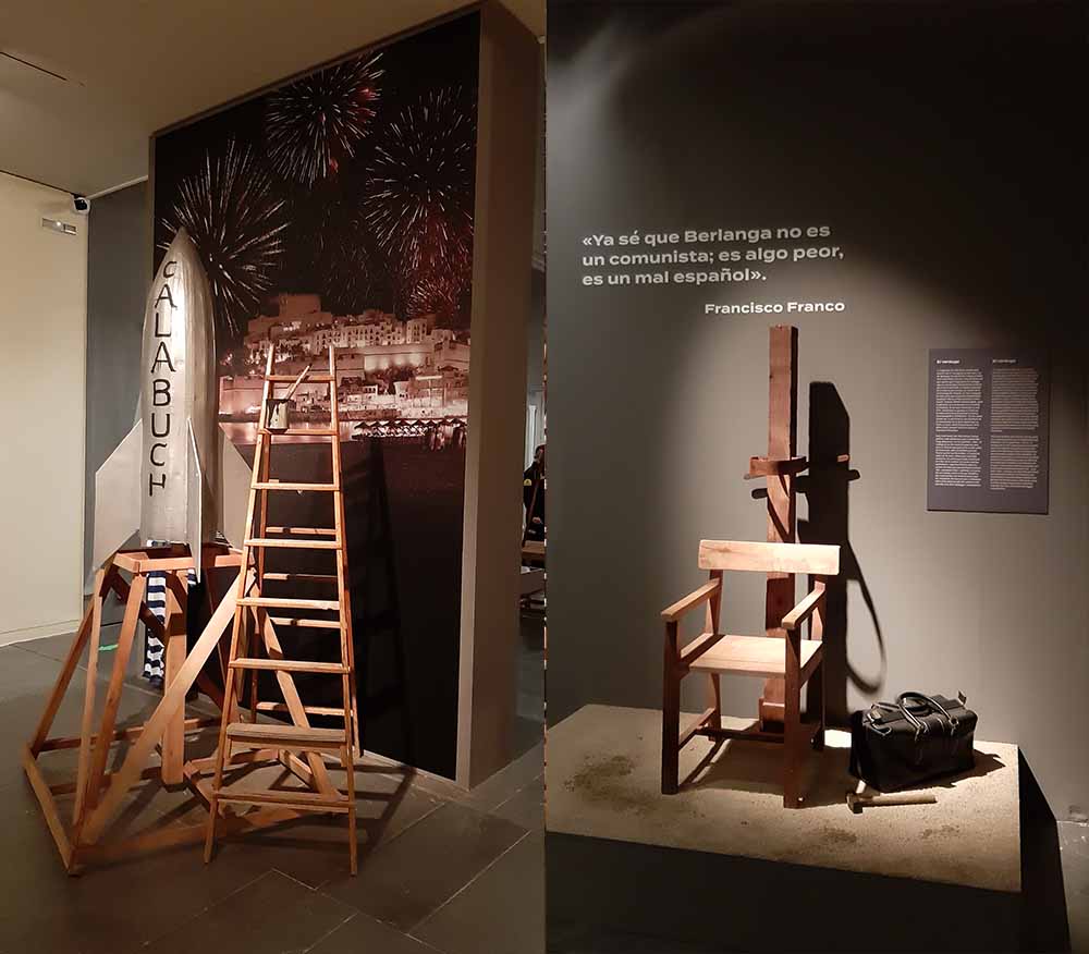 Estos espacios se completan con diferentes objetos que ayudan a contextualizar la obra de Berlanga. Así podemos ver el motocarro de Plácido, el cohete de Calabuch, el garrote vil de El verdugo, la muñeca hinchable de Tamaño natural o una reproducción de la cabeza de Berlanga que sirve para unir el mundo creativo del director con las Fallas.