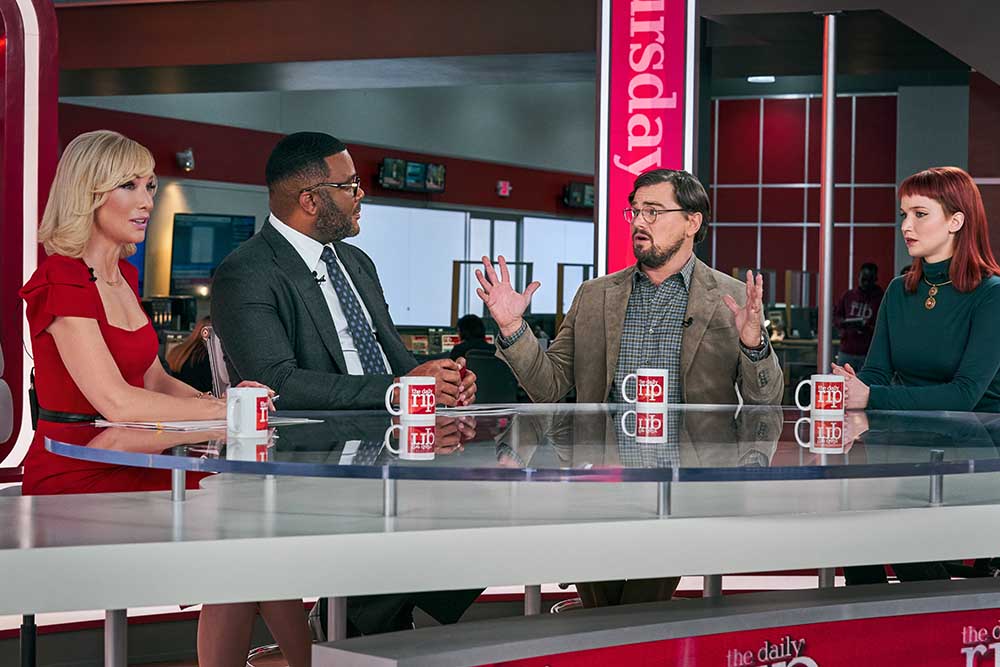Si en El vicio del poder el recurso utilizado para desarrollar la narración era el biopic, en No mires arriba la primera capa de la película remite a la estructura de las películas catastrofistas. Un científico (Leonardo DiCaprio) y su ayudante (Jennifer Lawrence) descubren la trayectoria de un cometa que colisionará con la Tierra, la comunicación a los responsables públicos, el tratamiento de la noticia en los medios, la búsqueda de una solución, la presencia de un referente –héroe– que evite la catástrofe conforma toda una serie de situaciones que nos remiten al modelo apocalíptico del fin del mundo.