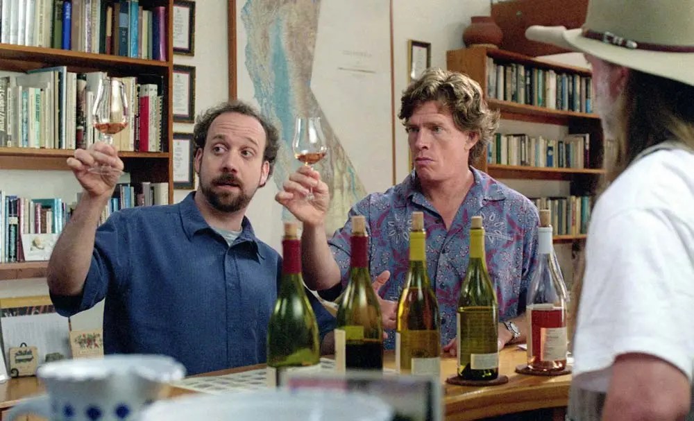 Entre copas, basada en la novela de Rex Pickett, utiliza la estructura de road movie para enmarcar una historia en la que Miles (Paul Giamatti) quiere regalar a su amigo Jack (Thomas Haden Church) una semana de entretenimiento disfrutando de una ruta vinícola antes de que este se case el siguiente sábado. Las dudas, ansiedades y objetivos ante la vida se irán revelando a lo largo de esos días con planteamientos diferentes. Miles pretende obsequiar a su amigo con una experiencia inolvidable que remarque su amistad; para Jack, esa semana supone un divertimento, una aventura, con la cerrar su etapa de soltero.