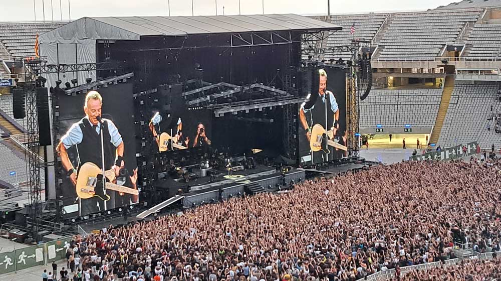 La noche del 22 de junio de 2024 en Barcelona, la segunda fecha en la ciudad es fría a pesar de encontrarnos ya en verano, y un cielo cargado de nubes grises amenaza con descargar lluvia durante todo el concierto –llovería nada más terminar–. Los conciertos en grandes estadios, necesarios para satisfacer la demanda, conlleva ciertos problemas. La acústica del Estadi Lluis Companys no es en absoluto mala, pero las primeras canciones, desde la grada, tienen un sonido extraño, unido al viento que lleva y trae ese sonido rompiendo la continuidad de este. Salvo la parte del front stage, el resto del público, más o menos alejado, observamos unas figuras empequeñecidas que se mueven dentro del gran escenario. Solo las espectaculares pantallas permiten seguir el concierto desde la lejanía, captando esos detalles o gestos que son necesarios para apreciar un concierto, a la vez que confirma que, efectivamente, esa figura pequeña que se mueve en el escenario es Bruce Springsteen.