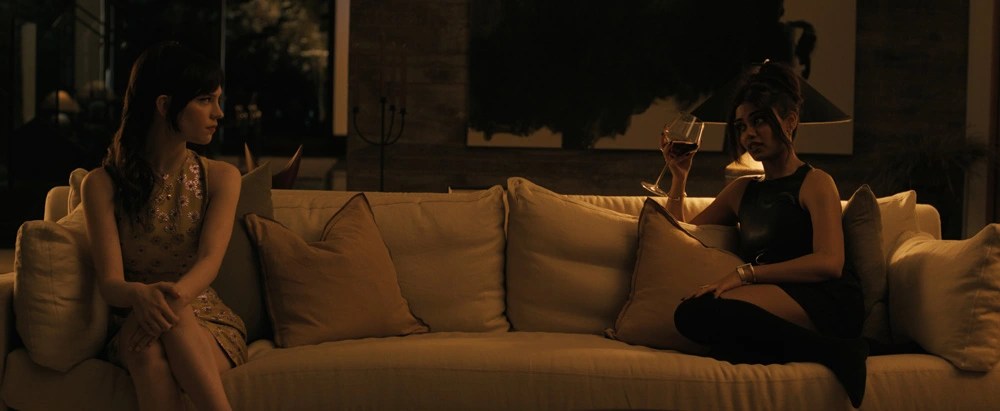 La película cumple con todos los parámetros del género, desarrollando un ambiente enrarecido, en el que poco a poco vamos detectando que hay algo que va más allá de la imagen superficial, y que culmina con un hecho violento que cierra el primer acto. Una excusa para desvelar la primera sorpresa de una trama que comenzará a desvelar sus cartas; aunque hay que insistir que el guion ya había mostrado indicaciones, pequeños comentarios, que justifican ese primer giro de la historia. Un giro que es el primero de los múltiples requiebros que Hancock propone para que el ritmo de la película se mantenga siempre con una cadencia frenética. De esta forma, un primer elemento positivo de La acompañante es que, siguiendo los códigos de la ciencia ficción y el thriller fantástico, es capaz de desarrollar una historia de una forma dinámica, en el que todo está hilvanado y justificado.