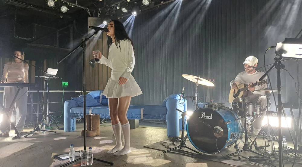 La puesta en escena funciona como declaración de intenciones. Sobre el suelo del escenario destaca un sofá azul dispuesto a modo de diván, epicentro simbólico del espectáculo. Desde él, Natalia canta, baila, se recuesta o se sienta al teclado, integrándose con naturalidad en un espacio que remite a la intimidad doméstica. La escenografía, sencilla pero efectiva, refuerza esa sensación de cercanía que atraviesa todo el concierto: cada canción parece dirigida a un interlocutor concreto, como si la artista estableciera un diálogo individual con cada espectador.