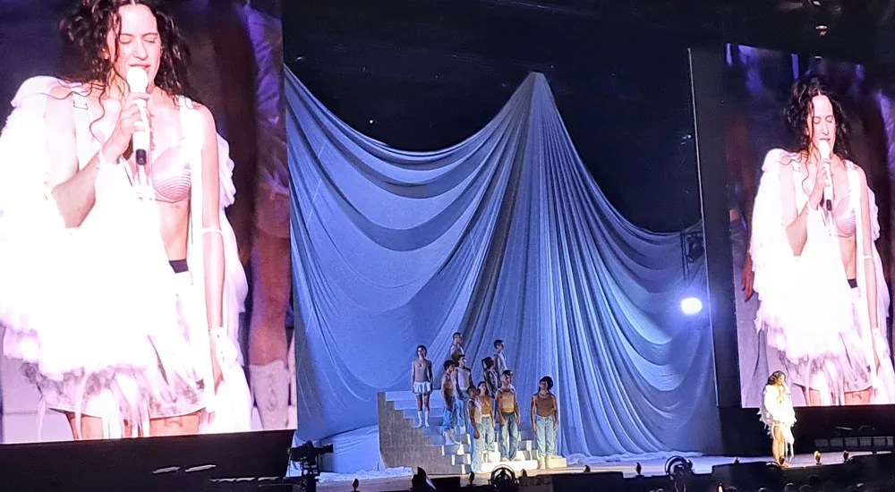 El primer acto se cierra con una imagen de gran carga simbólica: Rosalía aparece vestida como una vestal, envuelta en una estética casi ritual que refuerza el carácter solemne del momento. La escena adquiere una intensidad especial cuando interpreta la emocionante –y técnicamente exigente– Mio Cristo piange diamanti, con su rostro, captado en primer plano y proyectado en las grandes pantallas laterales, que revelan unos ojos visiblemente llorosos.