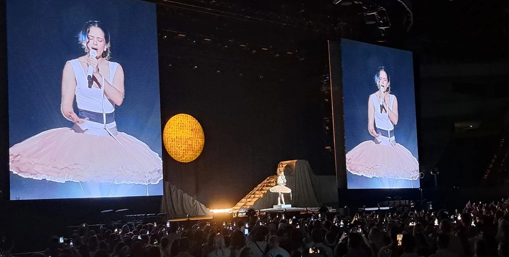 Este arranque funciona como una revelación que da paso al primer acto, centrado en Lux. Suena Reliquia, provocando el atronador karaoke cómplice del público cuando interpreta el verso “Crecí y el descaro lo aprendí / por ahí por Barcelona”. Con Porcelana y Divinize, el estatismo inicial da paso a una serie de coreografías en las que Rosalía parece levitar sobre el escenario, sostenida por los bailarines.