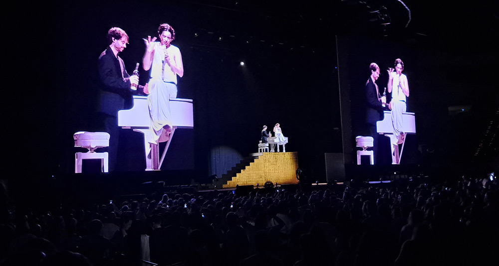 Es cierto que al ser un espectáculo coreografiado al milímetro se pierde cierta espontaneidad, limitada a los momentos de interacción con el público (cuando se dirige al público y conversa directamente o el juego con las pantallas que enfocan a personas del público para que imiten las poses de las obras de arte que van apareciendo).